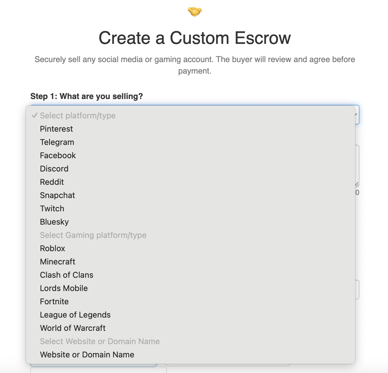 Custom escrow is made for sellers to offer other types of accounts that are NOT on Fameswap already, for accounts like Roblox, Telegram, Twitch, etc.